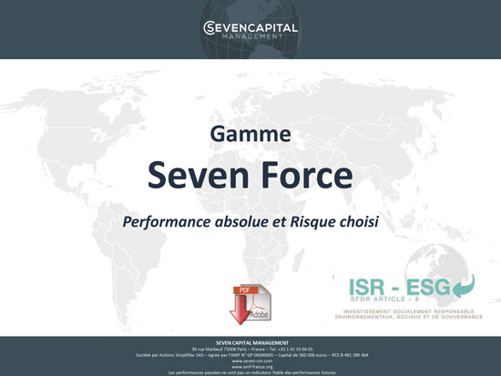 Seven Force 5  est un fonds flexibles diversifiés de performance absolue avec un objectif de volatilité : 5% et un objectif d’espérance de rendement 5%. L’analyse des risques permet de calibrer celui-ci avec un objectif de recul maximum de 2 fois le niveau de volatilité cible, 10 % pour Seven Force 5. Le processus d'investissement est basé sur une analyse propriétaire de Momentum :  macro-économiques,  prix &  risque. L'univers d'investissement du fonds couvre les obligations d’états et les marchés d’actions internationaux. Le fonds vise un objectif de rendement régulier en lien avec leur niveau de volatilité (5%). Le fonds offre une liquidité quotidienne et est sous la règlementation UCITS.